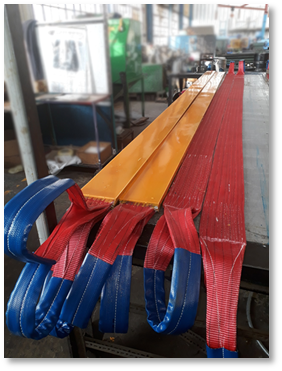 Polyurethane layers are bonded to the working surfaces of webbing slings to protect the webbing from cutting and from wear and tear. By doing this, we prolong the life of the webbing.